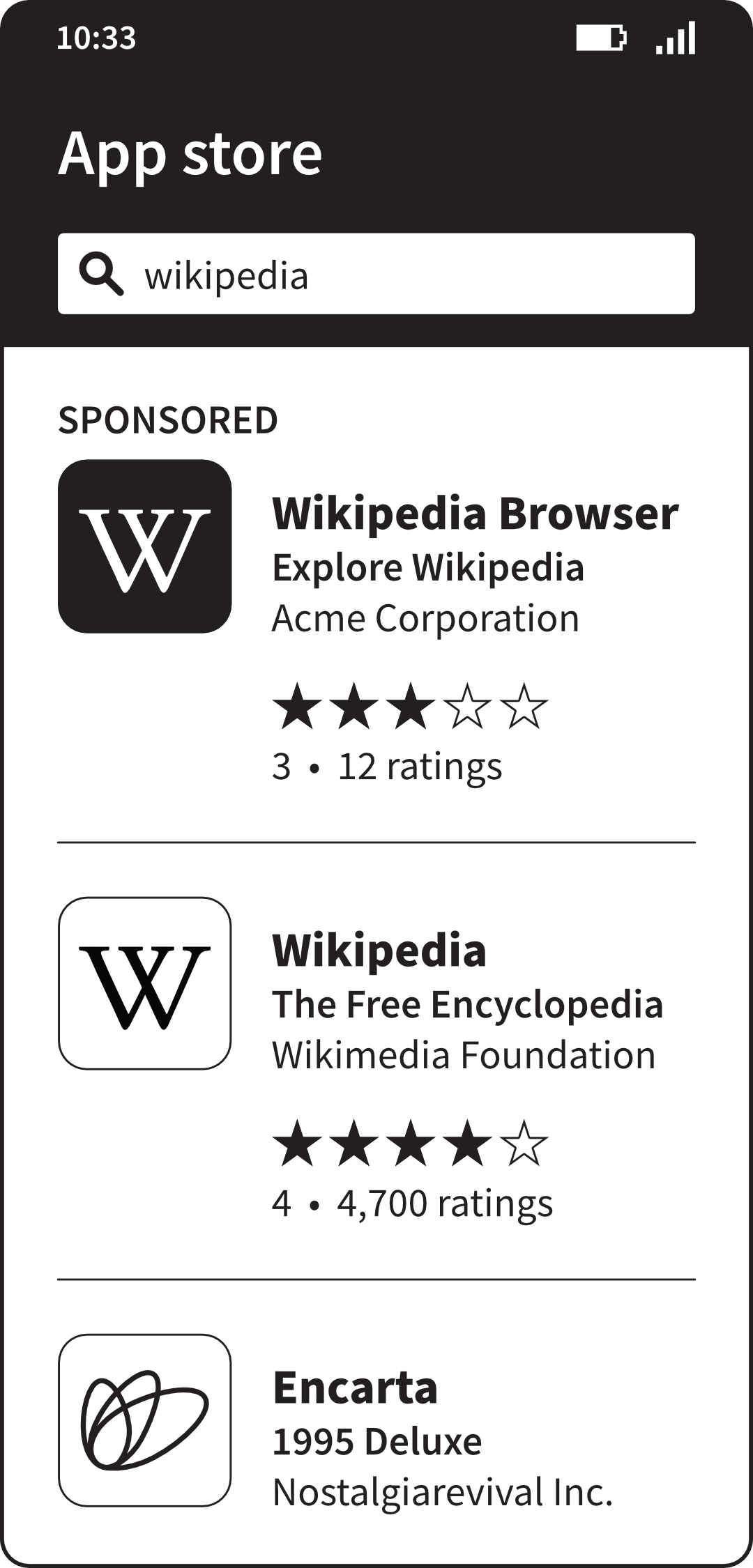 - The name. A fake app might use different or extra words, like ‘Wikipedia